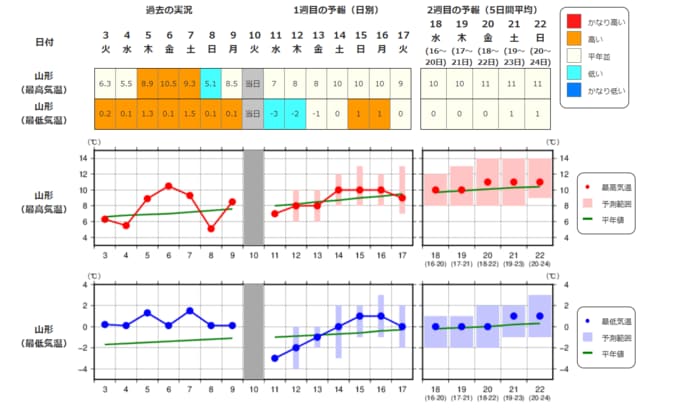 ・最近1週間の実況と今後2週間先までの気温の推移を表示しています。