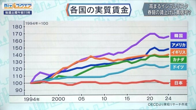 1994年~24年の30年間で「各国の実質賃金の推移」を比べると、アメリカやヨーロッパの主要国は実質賃金を大きく伸ばしているのに対し、日本はほぼ横ばい状態だ。