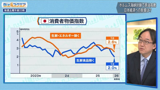 「ガソリンの暫定税率を廃止したり、消費税の食品の部分をゼロにするという議論が実現化してくれば、表面上は物価の上昇率が下がるので26年は一時的には実質賃金がプラスになるのではと期待されていた。ただ、このオイルショック的な動きでさらに値上げが増えると、実質賃金プラスが遠のくリスクが少し出てきた」