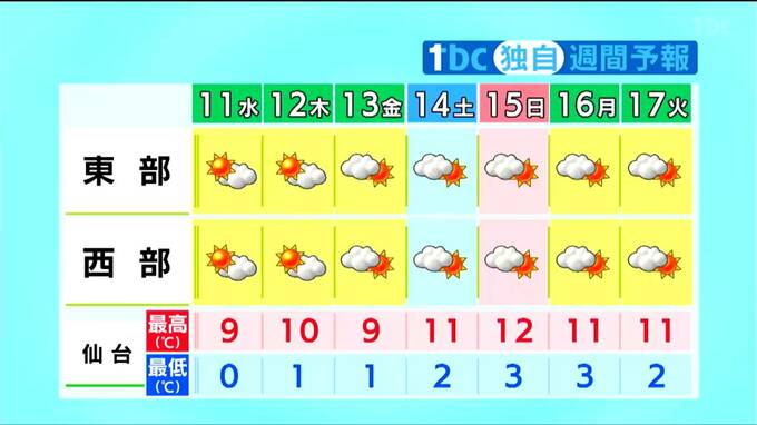 最低気温は、10日朝と同じくらいかやや低いでしょう。最高気温は8度から9度と、10日よりやや高い所が多く、平年並みの見込みです。