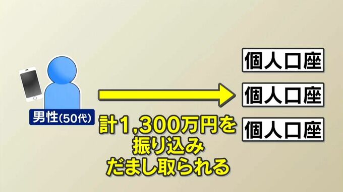 指示された投資アプリをインストールし、あわせておよそ1300万円を指定された複数の個人口座に振り込み、騙し取られたということです。
