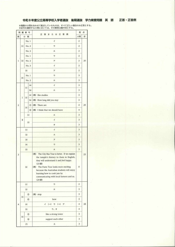 長野県高校入試2026【英語・問題と正答・正答例】後期選抜