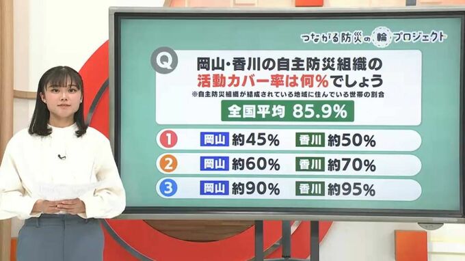 災害が発生した直後の避難誘導や、その後の避難所の運営などで大きな役割を果たすのが、近隣住民の協力・いわゆる「共助」だと言われています。その鍵となってくるのが、自主防災組織です。自主防災組織とは、地域住民が「自分たちの地域は自分たちで守る」という意識に基づき自主的に結成する防災組織のことです。そこで、きょうの問題です。自主防災組織が結成されている地域に住んでいる世帯の割合を示す数字を活動カバー率といい、全国では85.9%です。さて、岡山・香川の活動カバー率は何%でしょうか?(1)岡山約45%香川約50%(2)岡山約60%香川約70%(3)岡山約90%香川約95%みなさんはわかりますか?