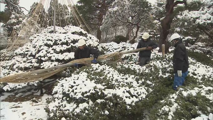 福島県会津若松市の御薬園で、冬の間、雪から木の枝を守る雪吊りの撤去作業が行われました。小枝佳祐記者「名残の雪が降る中、こちらの庭園では一足早く、春を迎える準備が始まりました」会津若松市の御薬園では、1…