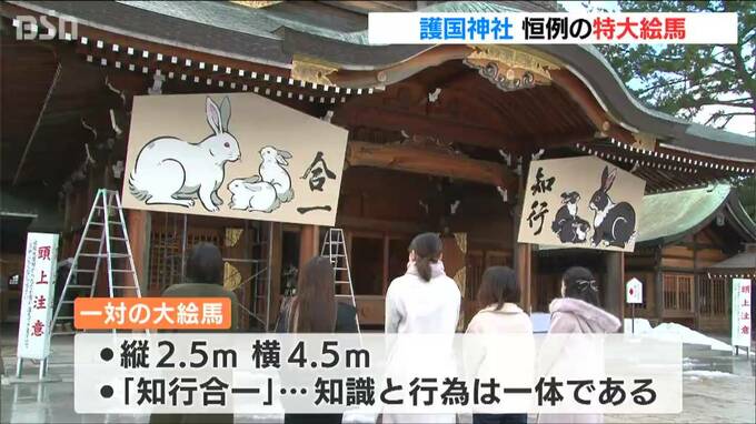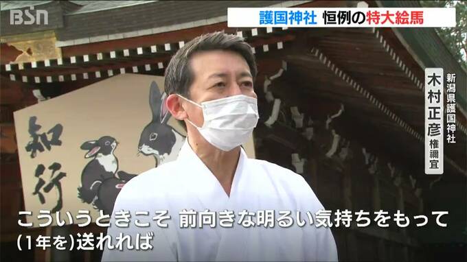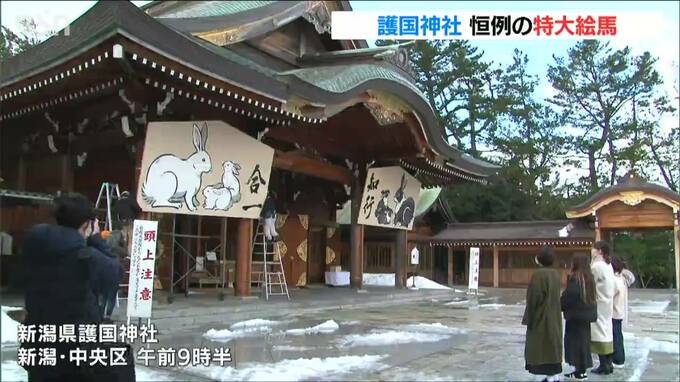 新潟市中央区の新潟県護国神社で初詣の準備が進められています。来年の干支・うさぎが描かれた恒例の特大絵馬がお目見えしました。