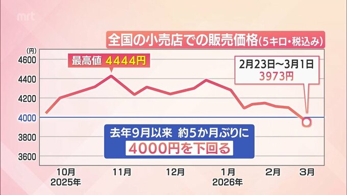 農林水産省が先週金曜日に発表したコメの全国の平均価格は5か月ぶりに4000円を下回りました。宮崎県内のスーパーでは、価格がどのように変化しているのか、取材しました。(山崎直人記者)「宮崎市のこちらのスー…