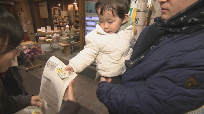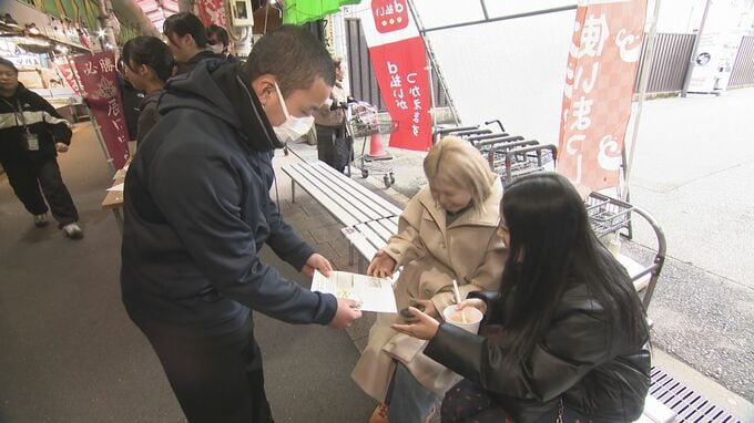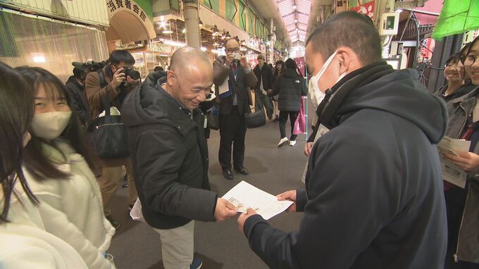観光客も多く訪れる、金沢市民の台所・近江町市場で配りました。