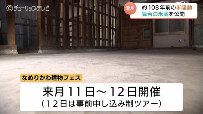 なめりかわ建物フェス実行委員長 法澤龍宝さん「この建物自体も外にトタンが貼られていて、米騒動の蔵だと、たぶんここを通っている方は感じていないところがあるのかなと思います。しかし中に入ってみると、当時のものがそのまま残っている。それが建物の魅力だと思うので。それを1番見てほしいなと」