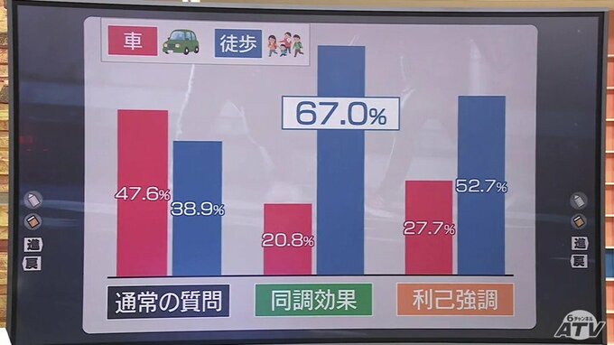 通常の質問のときは「徒歩避難」が38.9%でしたが、①同調効果のある質問では「徒歩避難」が67%。②利己強調の質問は「徒歩避難」が52.7%となりました。