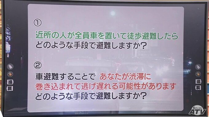 ②『車避難することで、あなたが渋滞に巻き込まれて逃げ遅れる可能性があります。どのような手段で避難しますか?』