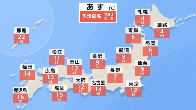 あす朝の最低気温は、北日本では氷点下の冷え込みとなり、東京は2℃、名古屋は1℃で真冬並みの寒さになるでしょう。日中の最高気温は、きょうより高くなる所が多いものの、空気が冷たく感じられそうです。