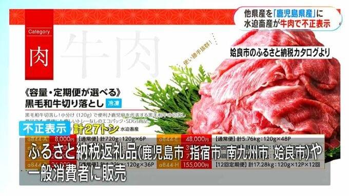 指宿市の水迫畜産が、産地や種類の違う牛肉を「鹿児島県産」や「黒毛和牛」と不正に表示して販売していたことが分かりました。不正表示の牛肉はふるさと納税の返礼品にもなっていて、農林水産省はきょう10日、表示の是正などを指示しました。