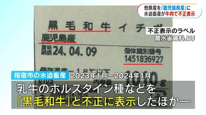 農林水産省によりますと、鹿児島県指宿市の水迫畜産は、2023年1月から2024年1月にかけて、乳牛のホルスタイン種などを「黒毛和牛」と不正に表示したほか、原産地についても沖縄県産や宮崎県産を「鹿児島県産」と不正に表示していたということです。