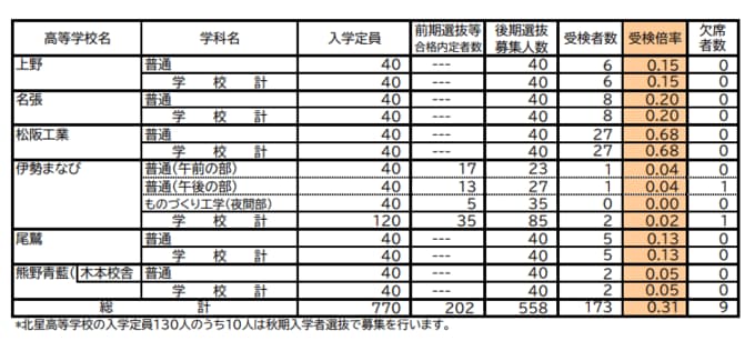 三重県立高校入試2026 後期選抜の受験倍率 桑名・理数2.53倍 四日市・国際科学2.51倍 神戸・理数2.83倍など 全校掲載・一覧