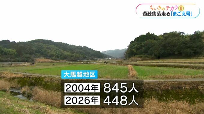 大馬越地区には2004年に845人が暮らしていましたが、ここ20年ほどで半分の448人に減りました。地区に唯一あった小学校は8年前に閉校。65歳以上の高齢化率はおよそ60パーセントです。