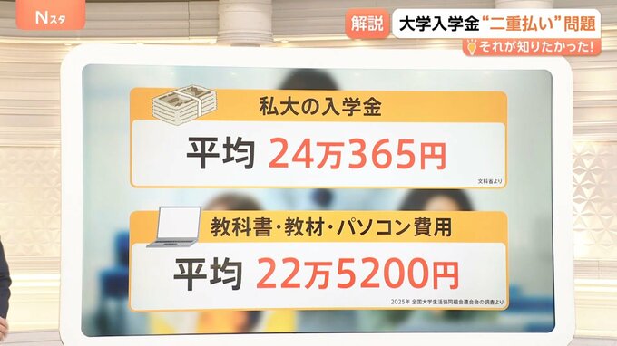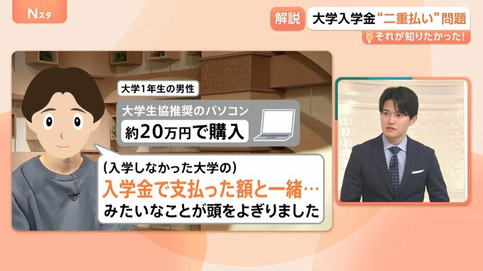 取材した大学1年生は、大学生協の推奨のパソコンを約20万円で購入し「(入学しなかった大学の)入学金で支払った額と一緒…ということが頭をよぎりました」と話していました。