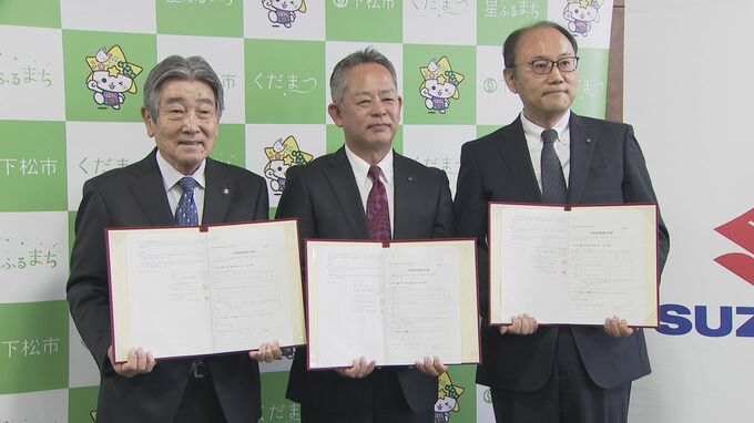 協定を結んだのは下松市とスズキ、宇部市に本社を置くスズキ自販山口の3者で、国井・下松市長ら代表の3人が協定書に署名しました。