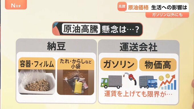 もちろん、さまざまな場面に原油は使われています。▼納豆の容器やフィルム、たれ・からしの小袋、▼運送会社のガソリンなどの値上がりというリスクはもちろんあります。