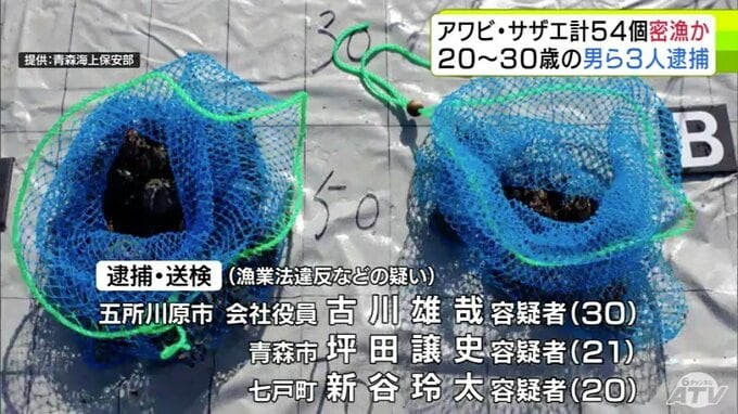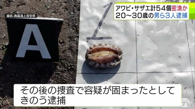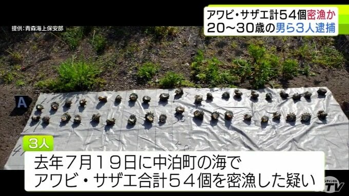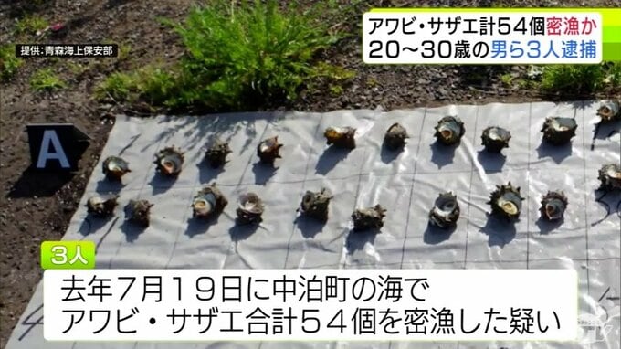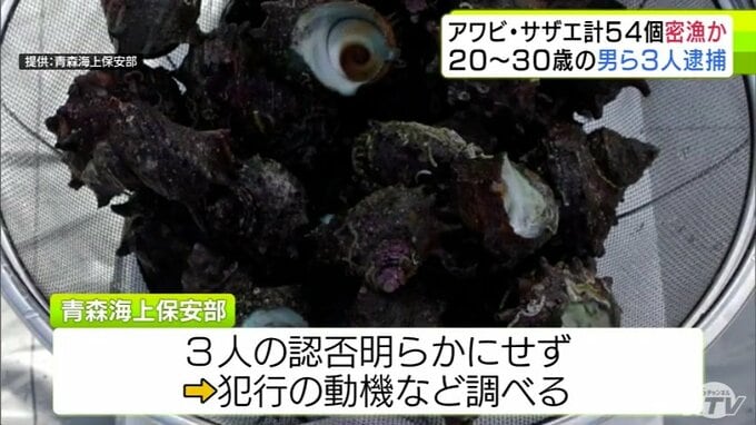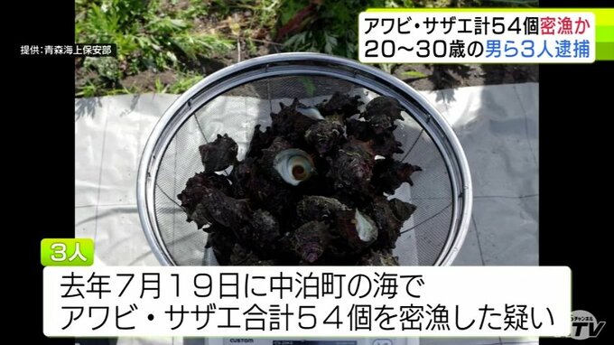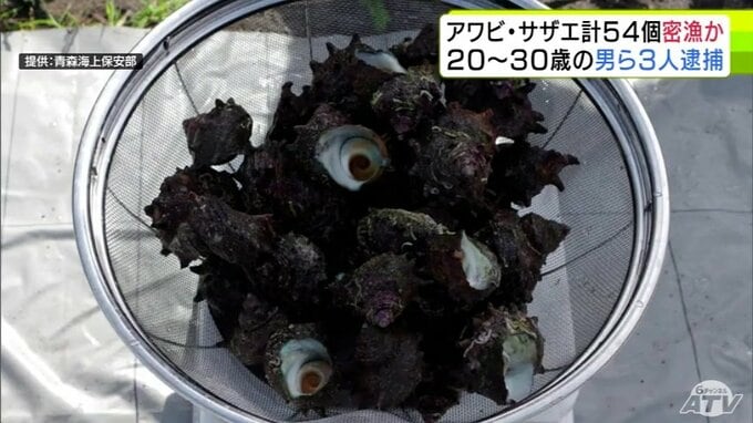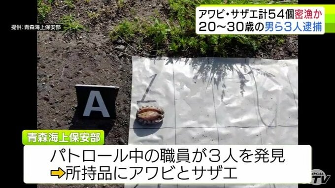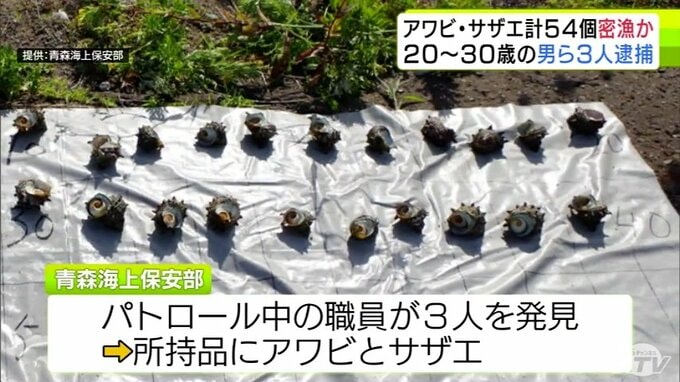 3. 【詳報】サザエ53個とアワビ1個を密漁か 30歳の会社役員など男ら3人を逮捕・送検 パトロール中の海上保安部職員が海に潜る3人を発見→所持品の中にアワビとサザエがあり捜査→逮捕へ 青森海上保安部