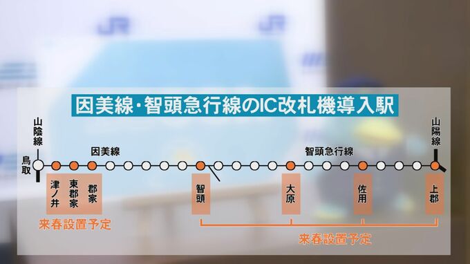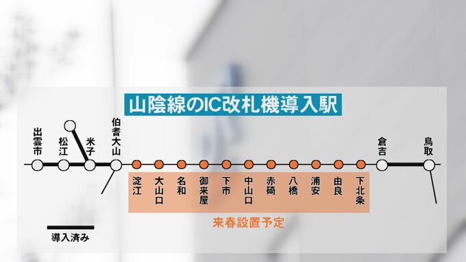 先月の定例会見で発表された内容によりますと、山陰線ではこれまでIC改札機の空白区間だった下北条駅から淀江駅までの11の駅に導入され、来年春には鳥取駅から出雲市駅までの全ての駅でICOCAなどの交通系ICカードを使って乗り降りできることになります。