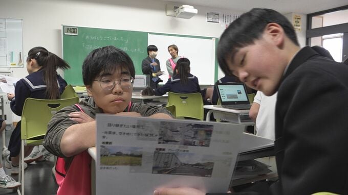 授業では生徒たちが班ごとに別れて地震直後の街の様子やその後の影響などを話し、瀬川さんや学生たちが聞き取ります。
