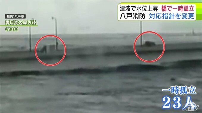 八戸市の八太郎大橋では、水位が上がり橋の両端が水没。頂上部分には住民と消防隊員あわせて23人がいましたが、1時間以上、孤立しました。