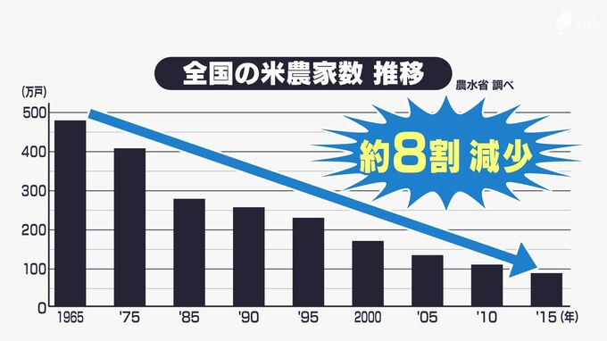 全国で1965年には480万戸だった米農家は2015年には93万戸。約80%減少しました。コメ農家は年々減り続けています。