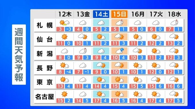 金曜日は雲の広がる所が多く、日中も空気が冷たい所が多くなりそうです。土曜日から日曜日は西日本や太平洋側で広く晴れて、日差しが暖かい所が多くなる見込みです。