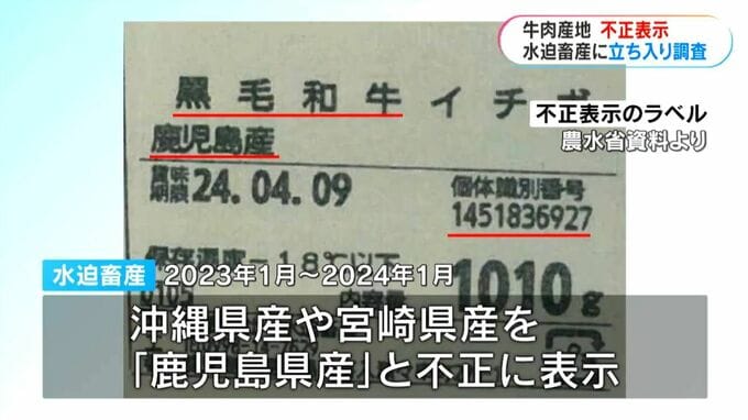 農水省によりますと、水迫畜産は2023年1月から2024年1月にかけて、乳牛のホルスタイン種などを「黒毛和牛」と不正に表示し、沖縄県産や宮崎県産を「鹿児島県産」と不正に表示していました。