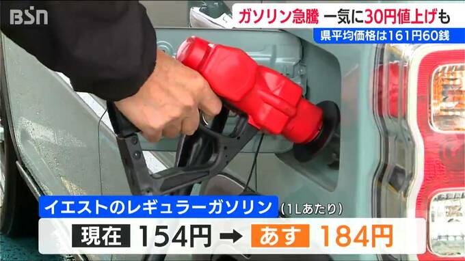 新潟市西蒲区のガソリンスタンド・イエストは、1リットル当たり現在154円のレギュラーガソリン価格を、12日には一気に184円へ値上げする予定だというとです。