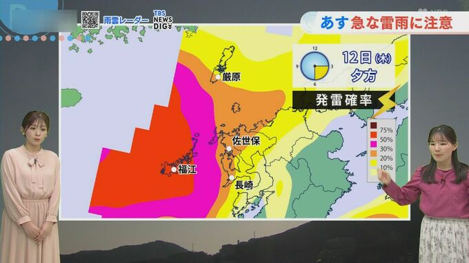 昼過ぎの発雷確率は対馬や五島で30%を超え、夕方には五島で50%以上という高い確率となります。雷が鳴るときは雨の降り方もザーッと強まります。