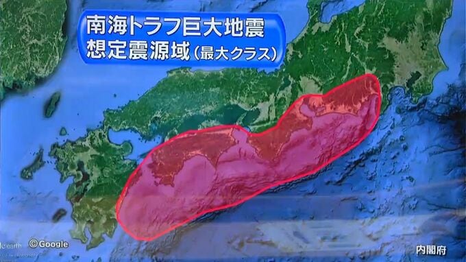今、日本で特に備えが必要とされているのが「南海トラフ巨大地震」です。想定震源域は、最大クラスで、西は宮崎県沖の日向灘から、東は静岡県の駿河湾までと広大です。