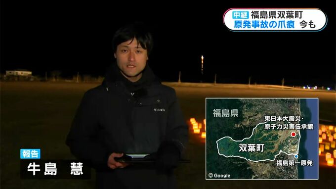 私がいるのは福島第一原発から北に4キロほどの場所です。ここには、震災の記憶を伝える施設があり、先程から追悼の花火も上がっています。広場には復興への願いを込めたキャンドルが灯されています。
