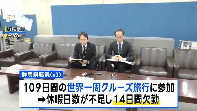 休暇日数が不足することを認識したうえで、109日間の世界一周旅行をして14日間欠勤したなどとして、群馬県職員が停職3か月の懲戒処分を受けました。