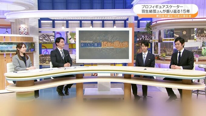 震災直後の2011年5月に開催されたチャリティーショーへの参加について、羽生さんは複雑な心境だったことを明かした。「こんなときに僕自身も被災して周りが本当にぐちゃぐちゃになっている中で、正直僕がスケート滑ってていいのかっていう後ろめたさもあったんですけれども、でも僕がそこにいて落ち込んだりとか、何も動けないよりは少しでも誰かの力になりたい、東北の力になりたい、宮城の力になりたいっていう思いで参加させていただきました」