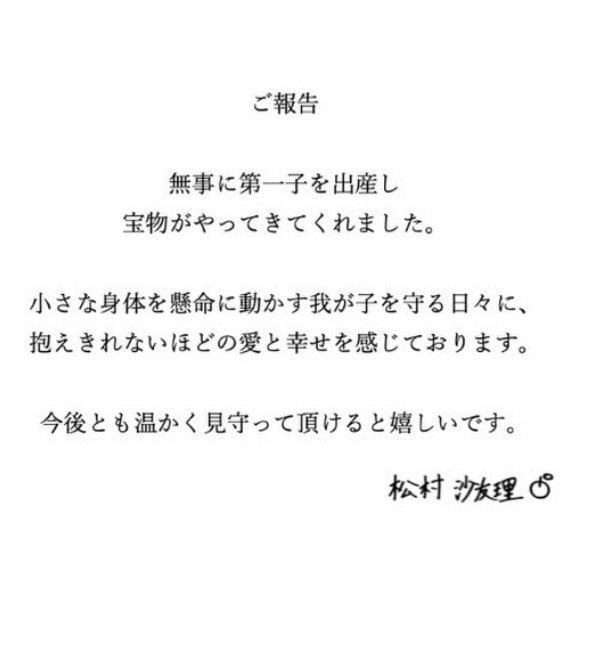 松村沙友理さんは、直筆の署名入りの文書をアップし「無事に第一子を出産し宝物がやってきてくれました。」と、報告。