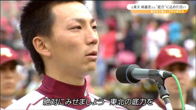 【元楽天イーグルス・嶋基宏さん】「東北の底力」あのスピーチから15年…恩師の背番号『77』と共にこれからの被災地支援への思い語る 東北放送 2026年3月12日(木) 20:00 国内 今も語り継がれる15年前のシーン、嶋 基宏さんの言葉でした。 嶋 基宏さん(2011年・楽天イーグルス選手時): 「この時を乗り越えた向こう側には、強くなった自分と明るい未来が待っているはずです。『絶対に見せましょう 東北の底力を』」