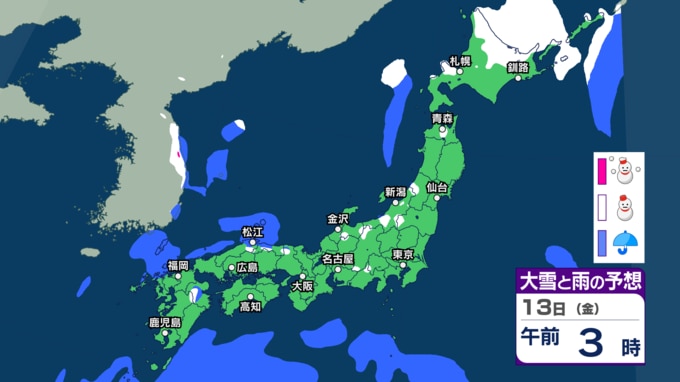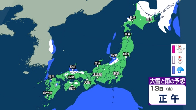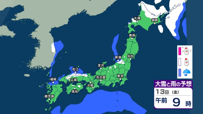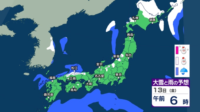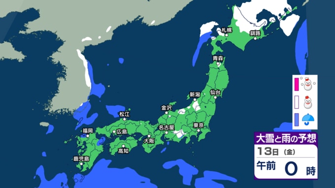北海道はあす13日朝までの24時間に40cmの降雪か 東日本・西日本・南西諸島は落雷や急な強い雨などに注意【今後の雨雪シミュレーション・12日正午更新】