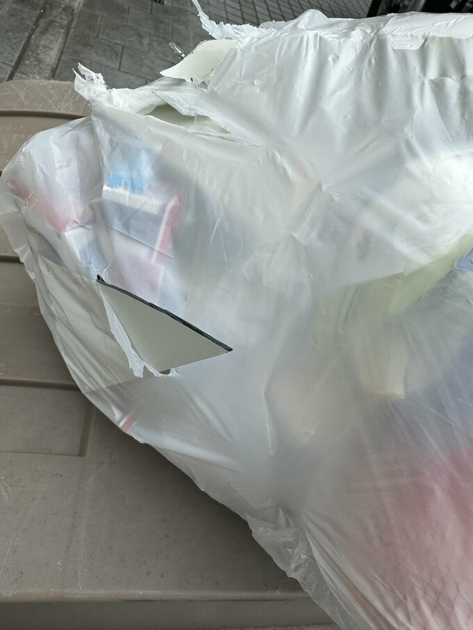 滝沢さんは「可燃ごみにガラスなどの割れ物が入っていると清掃員が怪我します!」と、鋭利な割れ物が突き出たゴミ袋の画像を添えて投稿。
