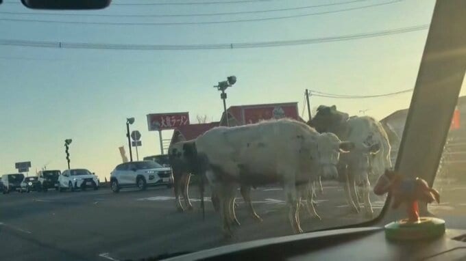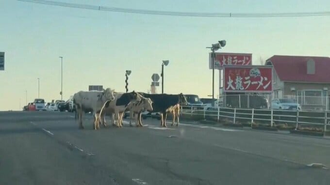 道路を塞ぐ「6頭の牛」一時渋滞に