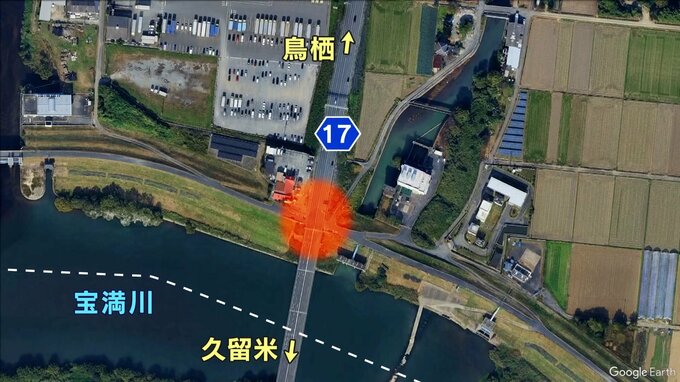 久留米市との境を流れる宝満川にかかる橋の手前で、普段から交通量が多い場所です。