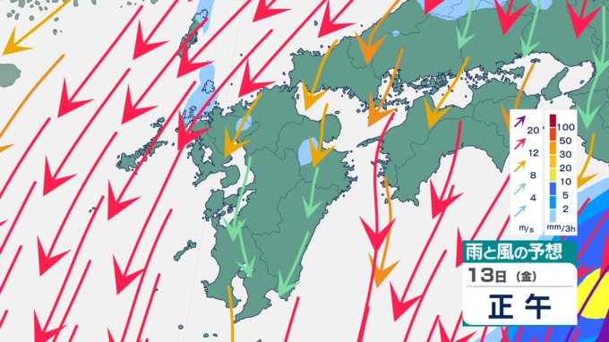 雨と風のシミュレーションによると、12日(木)の夜には、風速20メートル以上を示す「真っ赤な矢印」の猛烈な風が、海側から九州北部へと吹き付ける予想となっています。雨雲も同時に流れ込み、12日夜から荒れた天気となる見込みです。