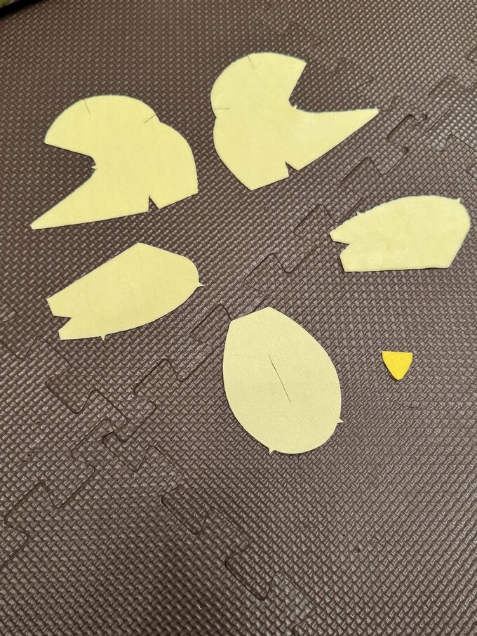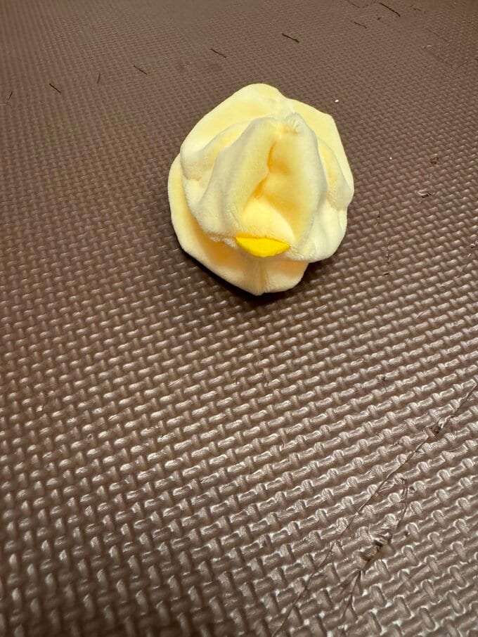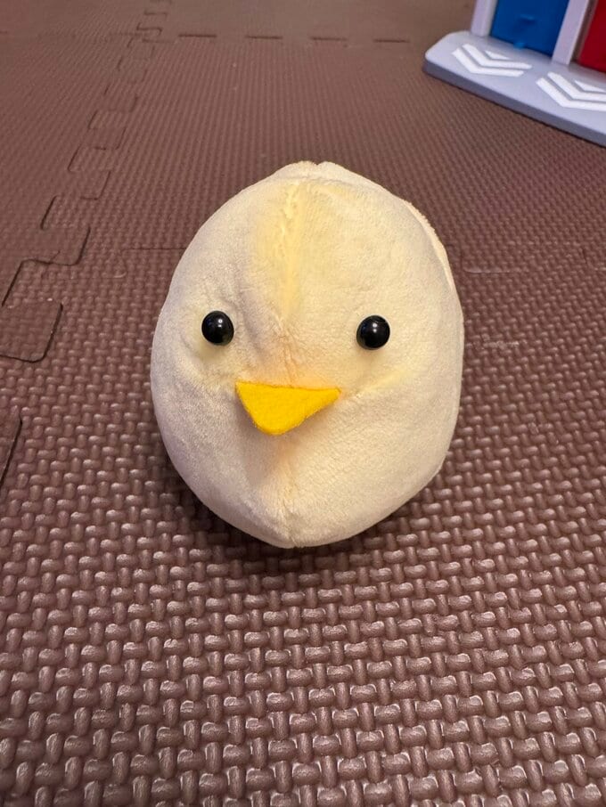完成したひよこのぬいぐるみは、淡い黄色の丸い体にくちばし、黒いつぶらな瞳が特徴的です。ふわふわとした質感で、愛らしい表情を見せています。