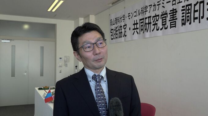 調印式で、包括協定書と共同研究覚書が更新されました。岡山理科大学は2013年以降、恐竜類などの研究でモンゴル科学アカデミー古生物学研究所と協力関係を築いています。その中で、さらに連携を深め、新たに標本の借り出しや、骨組織がわかるデータを取り扱えるようにすることなどが狙いです。
