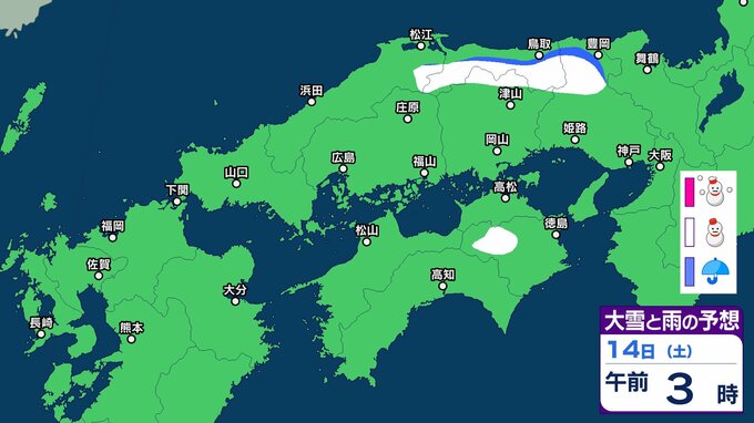【中四国の雪 どうなる?】広島・岡山・山口・鳥取・島根・香川・愛媛・高知・徳島 12日(木)~17日(火)3時間ごとの雪雨シミュレーション 13日(金)から14日(土)にかけて山地沿いで雪の予想【気象庁 12日現在】 RSK山陽放送 2026年3月12日(木) 17:00 国内 14日(土) 12日(金)~17日(火)3時間ごとの雪雨シミュレーション 12日(金)~17日(火)3時間ごとの雪雨シミュレーション