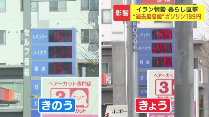 画面左側が11日で、レギュラーガソリンの価格は161円が目立っていましたが、画面右側の12日は、価格が一気に値上がり。189円と表示されていました。