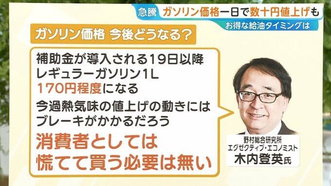 「補助金が導入される19日以降、レギュラーガソリンは1Lあたり170円程度になる。今過熱気味の値上げの動きにはブレーキがかかるだろう。消費者としては慌てて買う必要はない」と話しています。