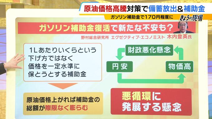 価格を一定水準(170円)に保とうとすれば、原油価格の上昇に伴い補助金の総額が際限なく膨らむリスクが生じます。そうなれば日本の財政悪化が世界的に意識され、