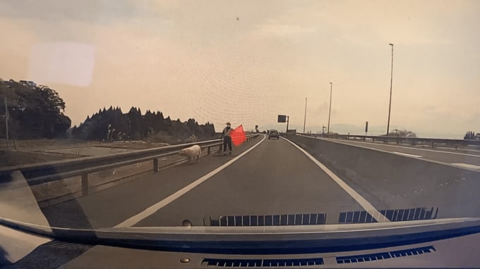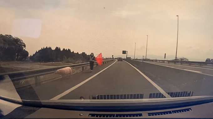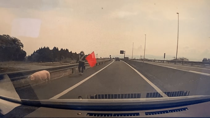 さらに車が進むと、路側帯で赤い旗を持った職員に誘導されるように、とぼとぼと歩くブタ1頭が写っていました。
