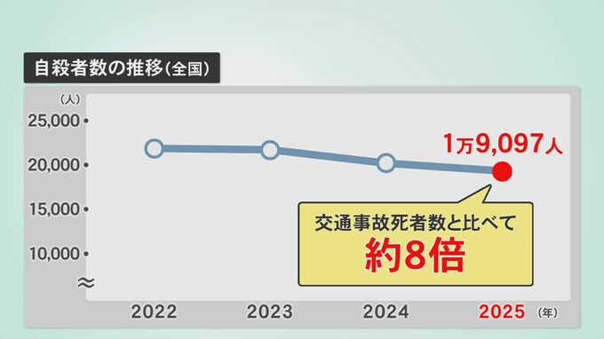 警察庁によりますと、全国の自殺者数は2025年までの4年間で減少傾向にあるものの、2025年1年間でおよそ1万9000人で交通事故死者数と比べておよそ8倍の数字です。